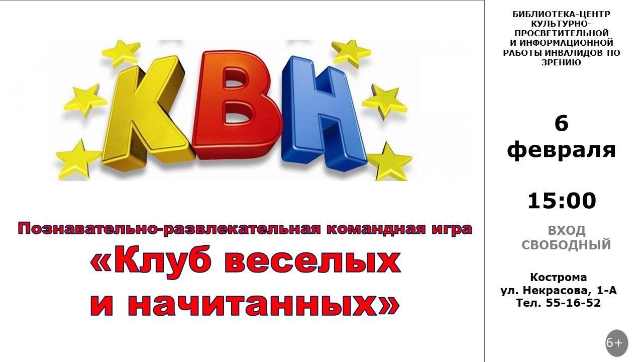 Приглашаем любителей интеллектуальных игр принять участие в КВН, но расшифровывается эта аббревиатура немного по-другому: «Клуб весёлых и... начитанных». Наши знатоки славятся своей эрудицией, талантами, юмором и начитанностью, которые они в полной мере смогут проявить на нашей программе.