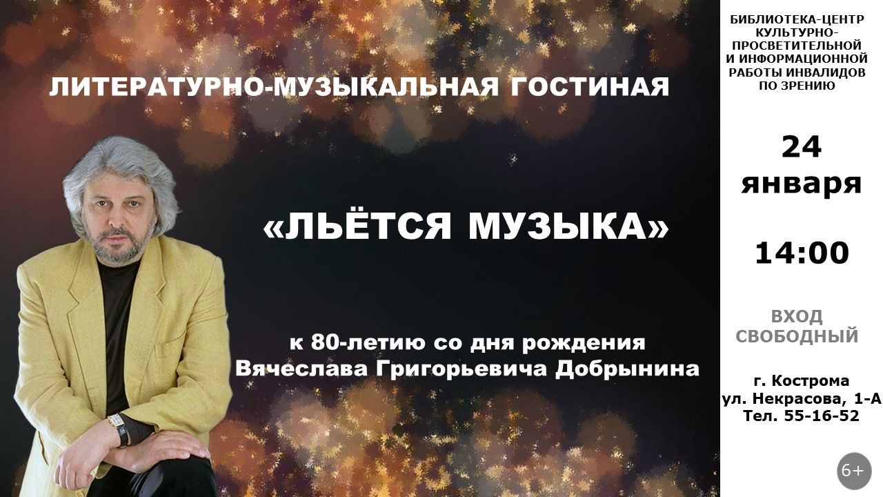 24 января 2026 года в 14:00 клуб любителей литературы и искусства «Таланты и поклонники» приглашает на вечер памяти композитора Вячеслава Добрынина